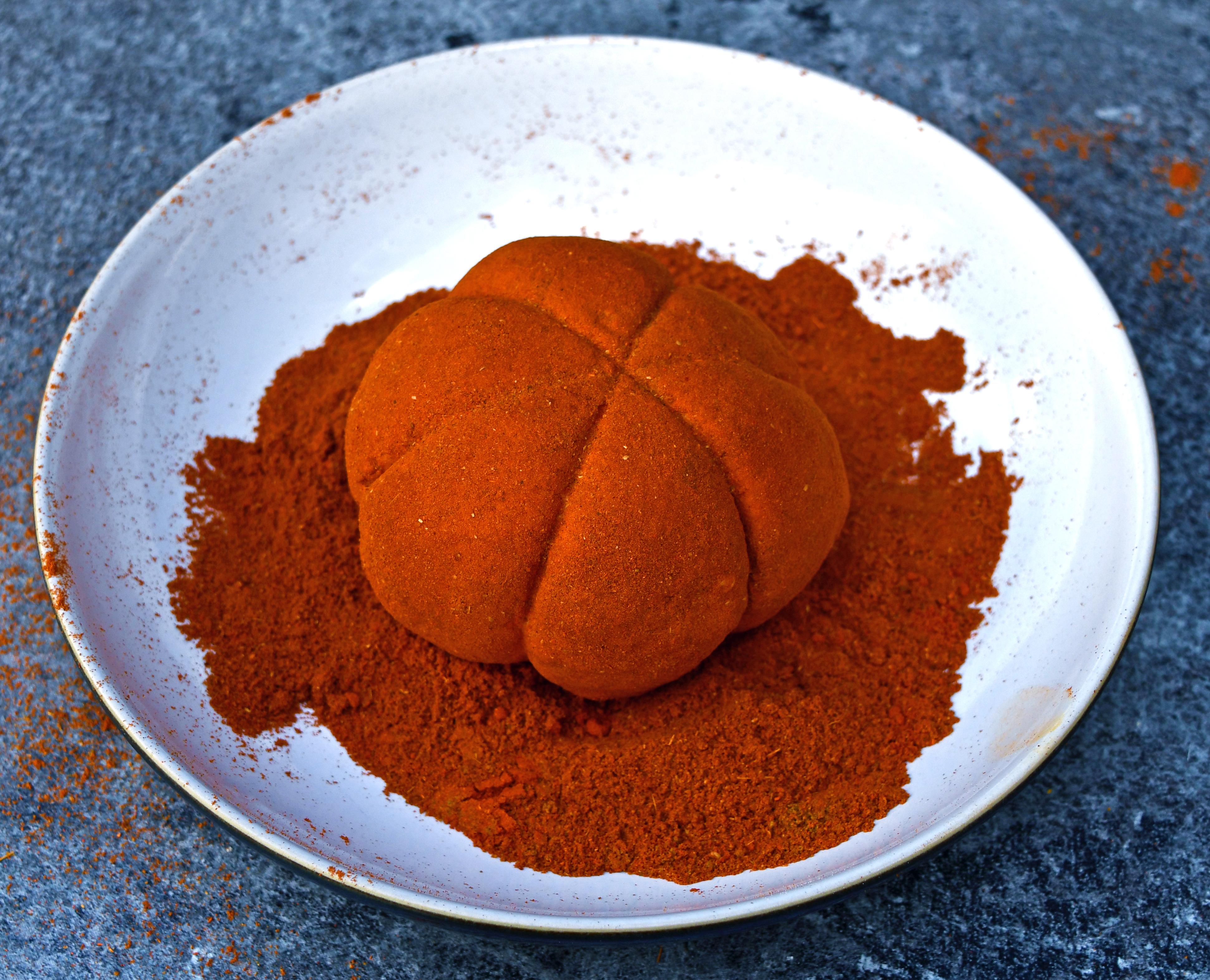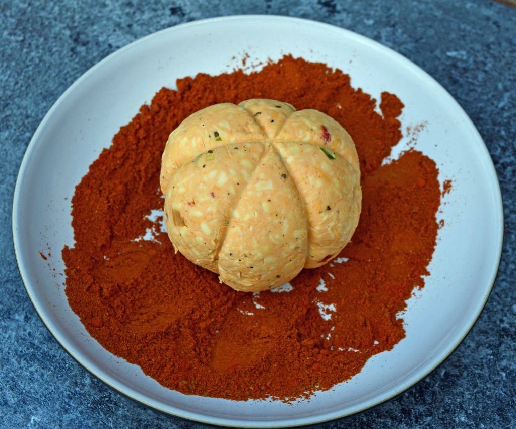 Unwrap the chilled cheese ball and place onto the spices, before dusting with the coating all around and brushing off any excess using a dry pastry brush. The pumpkin is now ready for its stalk – use the stalk from the pepper you grilled earlier (if you don’t happen to have a hoard or faux pumpkin stems!)