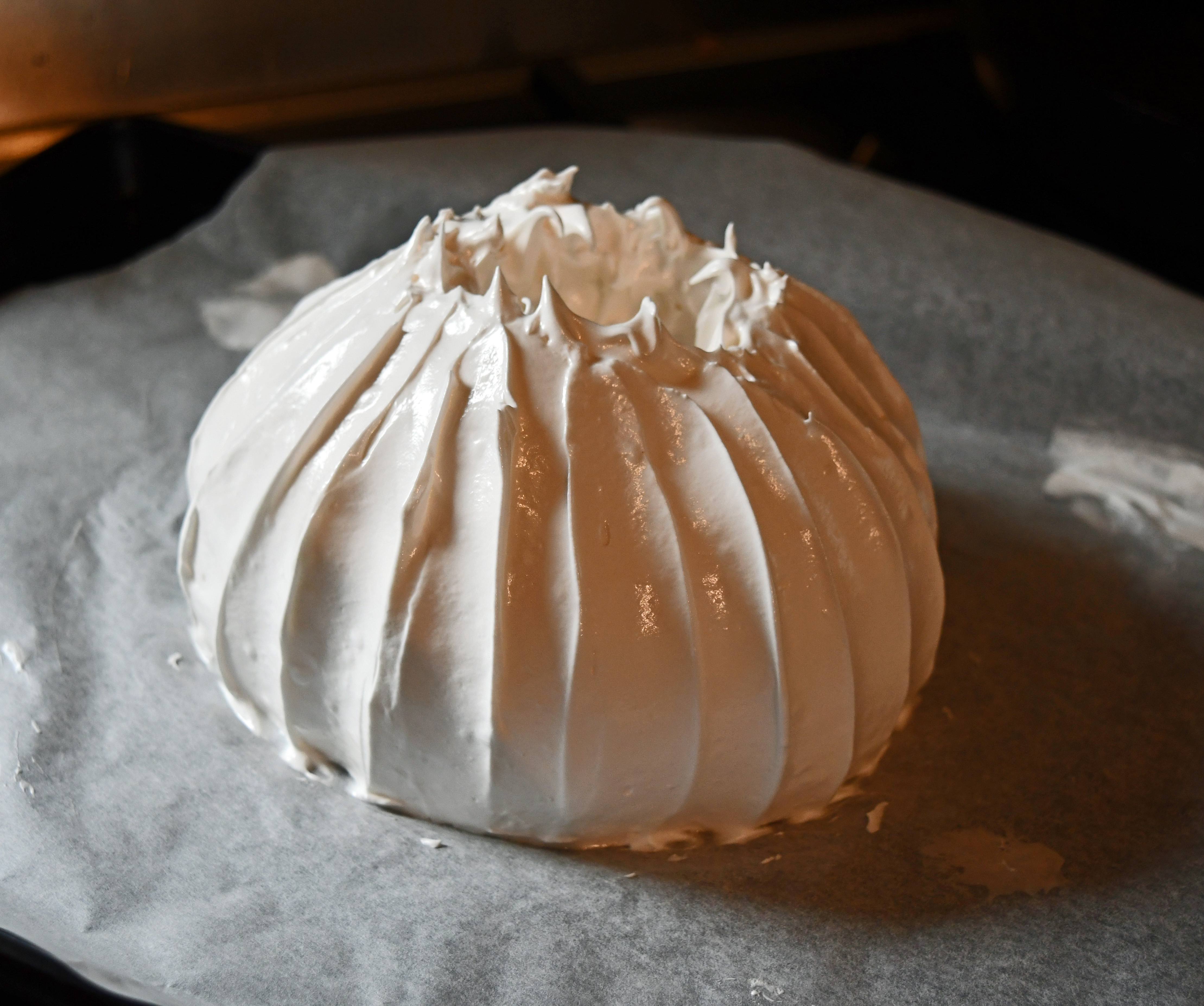 It should be soft and a little chewy in the middle, but not wet and eggy! The centre will collapse a little which creates a pocket for all the berries and cream. Leave it on the parchment until you are ready to decorate as its quite fragile, mine has a few cracks.