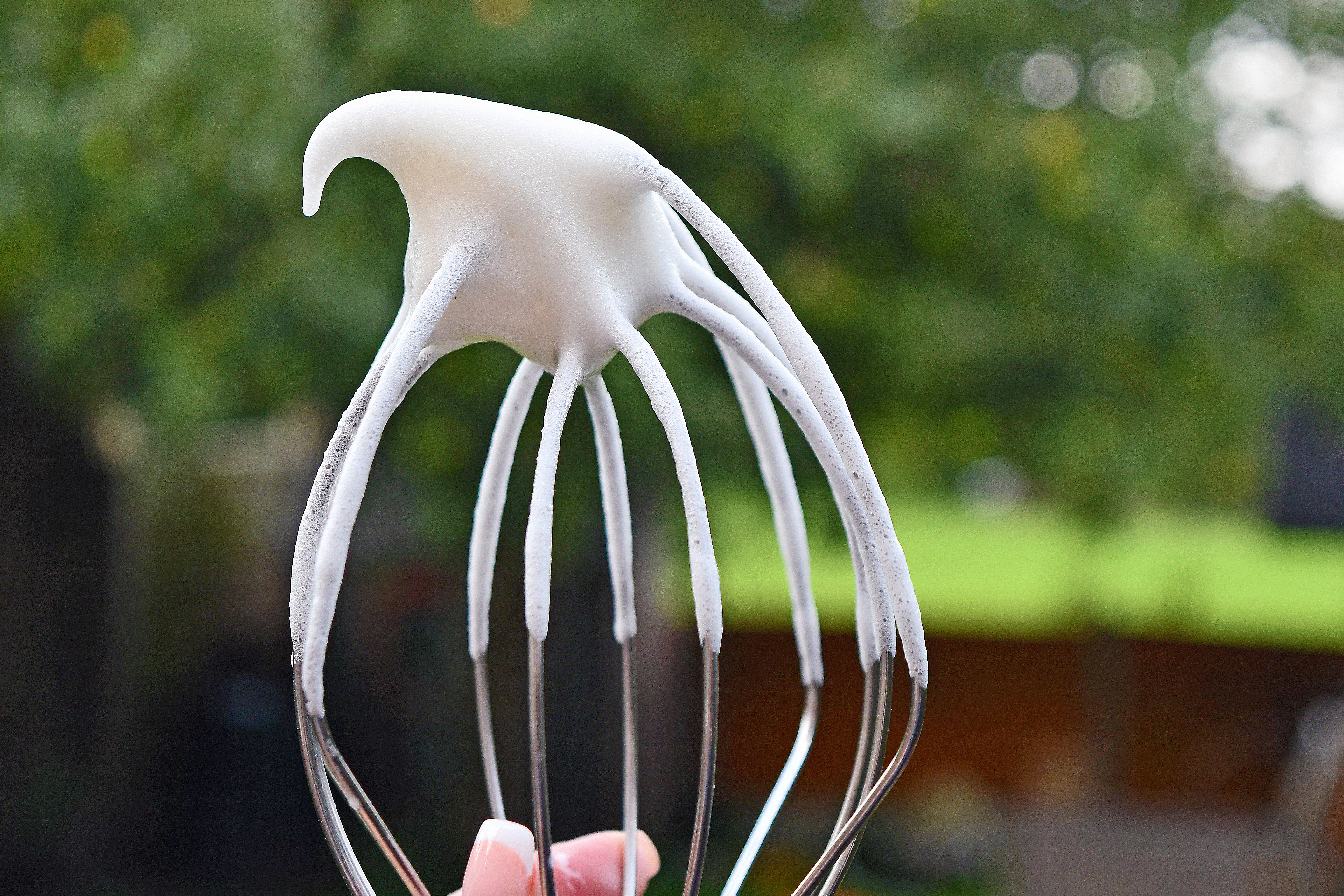 Then gradually add the sugar a spoonful at a time, giving it plenty of time to whisk into the egg whites.