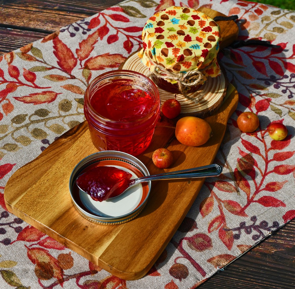 Crab apple jelly can be made in small quantities and there is already lots of pectin in them, so you don’t need to go out and buy special jam sugar. However, if you are nervous about it setting, then you can always slice in a lemon (with the pips) which will help.